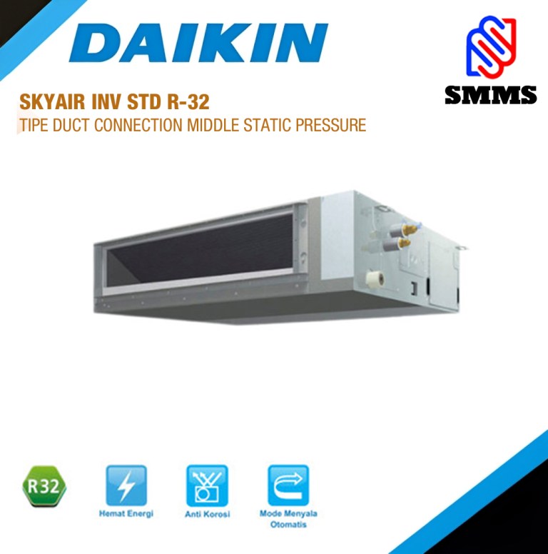 SBFC-DV-R/L Daikin SkyAir Inverter Ceiling Duct Connection Middle Static Pressure. Daikin seri SKYAIR Inverter Penghematan Energi Seri inverter baru ini mengurangi konsumsi energi selama pendinginan. Pengurangan konsumsi daya ini memberikan pendinginan yang cepat dan efektif sambil mengurangi tagihan listrik. Fitur AC Split Duct Inverter R32 Middle Static adalah Teknologi inverter lebih ekonomis, Pendinginan udara simultan, Desain dan Instalasi Fleksibilitas, Kecepatan kipas yang dapat dipilih 3 langkah dan Otomatis, E.S.P. yang dapat diatur, Fungsi penyesuaian laju aliran udara otomatis, Wadah pembuangan antibakteri ion perak, dan Smart Airflow Control.